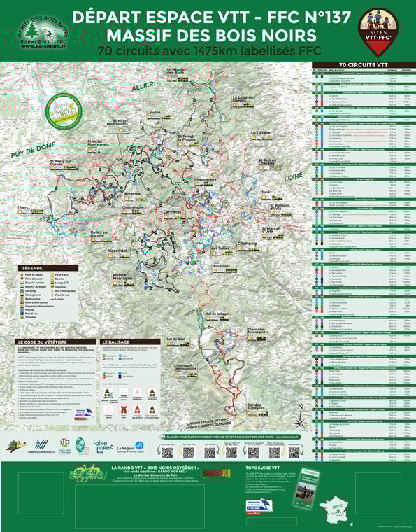 Depuis le 1er Aout 2020, L’ESPACE VTT DU MASSIF DES BOIS NOIRS compte 70 circuits pour 1475 km de chemins balisés repartis comme ceci :